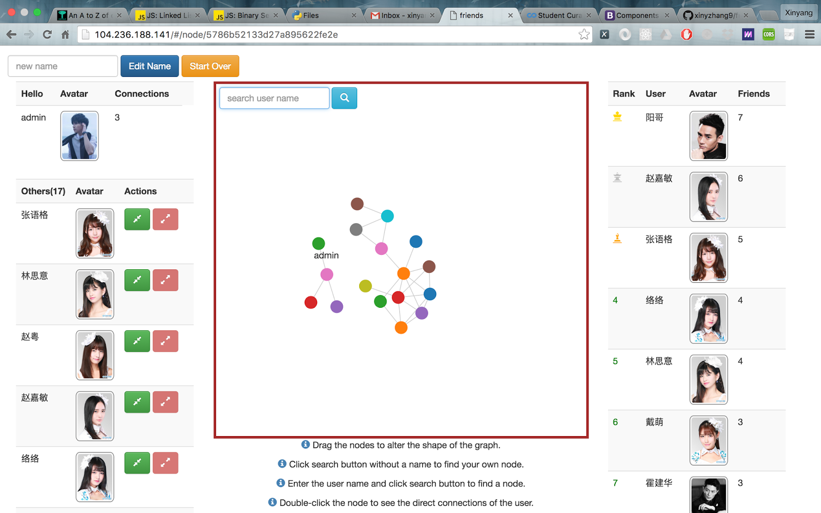On the left side is the control panel, user can select “connect” or “disconnect” on any of other users. The middle panel displays the real-time networks of all the users. Each user is represented as a distinct node. Links simply mean they have connections between each other.